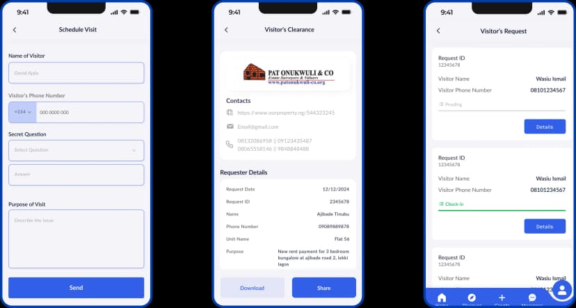 Estate managers can easily view incoming visitors, as well as monitor their check-in and check-out times, ensuring accurate records of when visitors enter and leave the premises. Additionally, the app tracks access history, allowing property managers to review past visits and confirm the legitimacy of visitor activities.